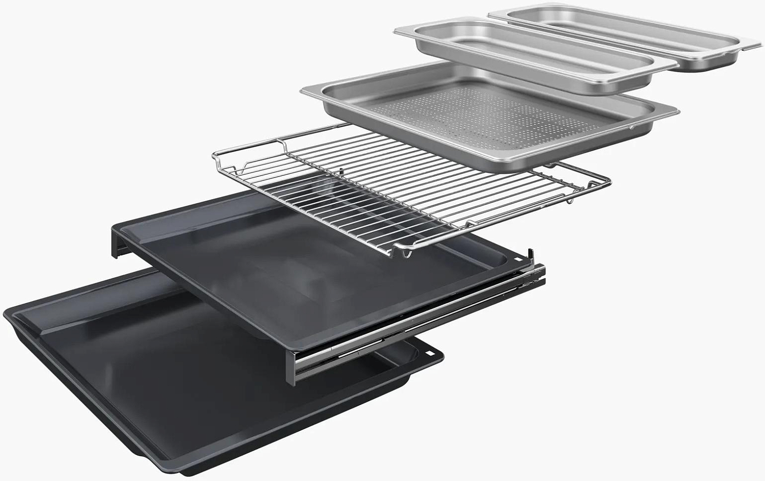 Комплектация 1 эмалированный противень, 1 универсальный противень, 1 комбинированная решетка, паросборник с отверстиями размер XL, паросборник без отверстий размер M, паросборник с отверстиями размер M, термощуп, телескопические направляющие