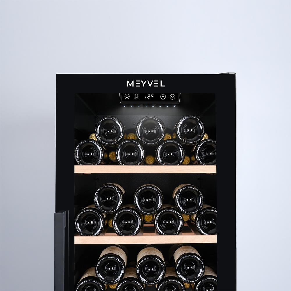 Meyvel MV133-KBF1 — отдельностоящее устройство, поэтому можно разместить его в любом удобном месте ресторана, отеля, бара или домашней винной комнаты без встраивания в мебель. Это удобно не только для создания стиля и атмосферы в интерьере, но и для предоставления легкого доступа к винам.