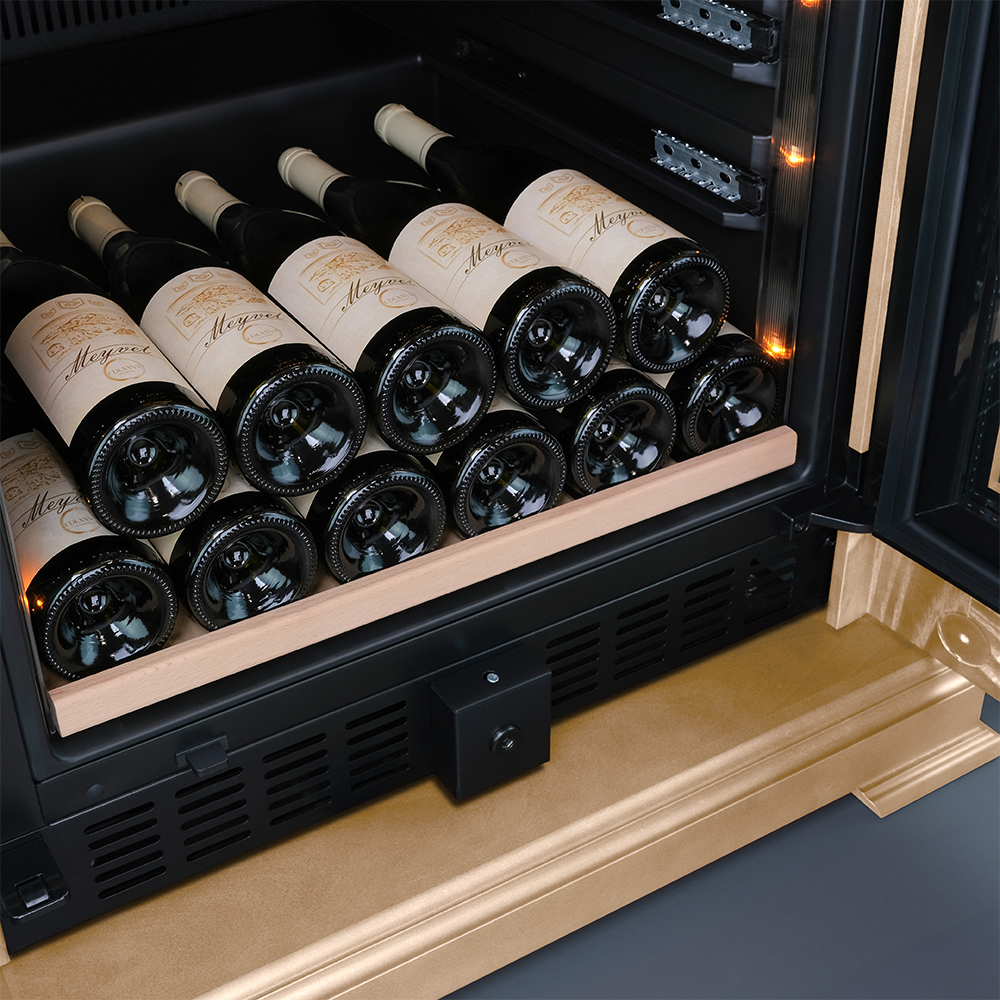 Винный шкаф предназначен для профессионального и длительного хранения различных сортов вин (до 174 бутылок типа Бордо). Он так же оснащен дверью с защитой от ультрафиолетовых лучей и поддерживает влажность в диапазоне 60-80%, как в настоящем винном погребе. Стальной корпус обшит натуральным буком, который выдерживает большие нагрузки и обладает красивой текстурой.