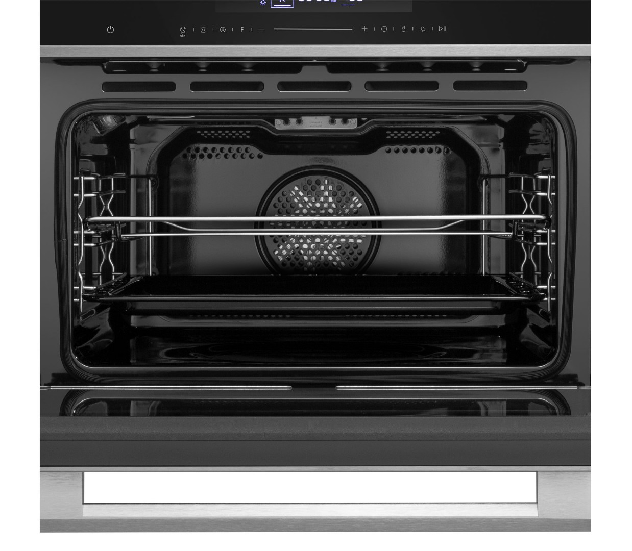 Фронтальная панель сделана из высококачественного жаропрочного стекла . Цельнометаллическая ручка дверцы из матированной нержавеющей стали лаконично поддерживает общий стиль и не нагревается во время готовки.